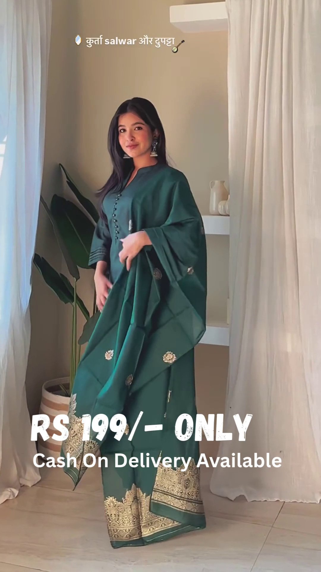 The image shows the complete ensemble in a serene setting, highlighting the outfit’s flattering fit and coordinated design. Text in Hindi at the top reads “कुर्ता salwar और दुपट्टा” (Kurta salwar aur dupatta).