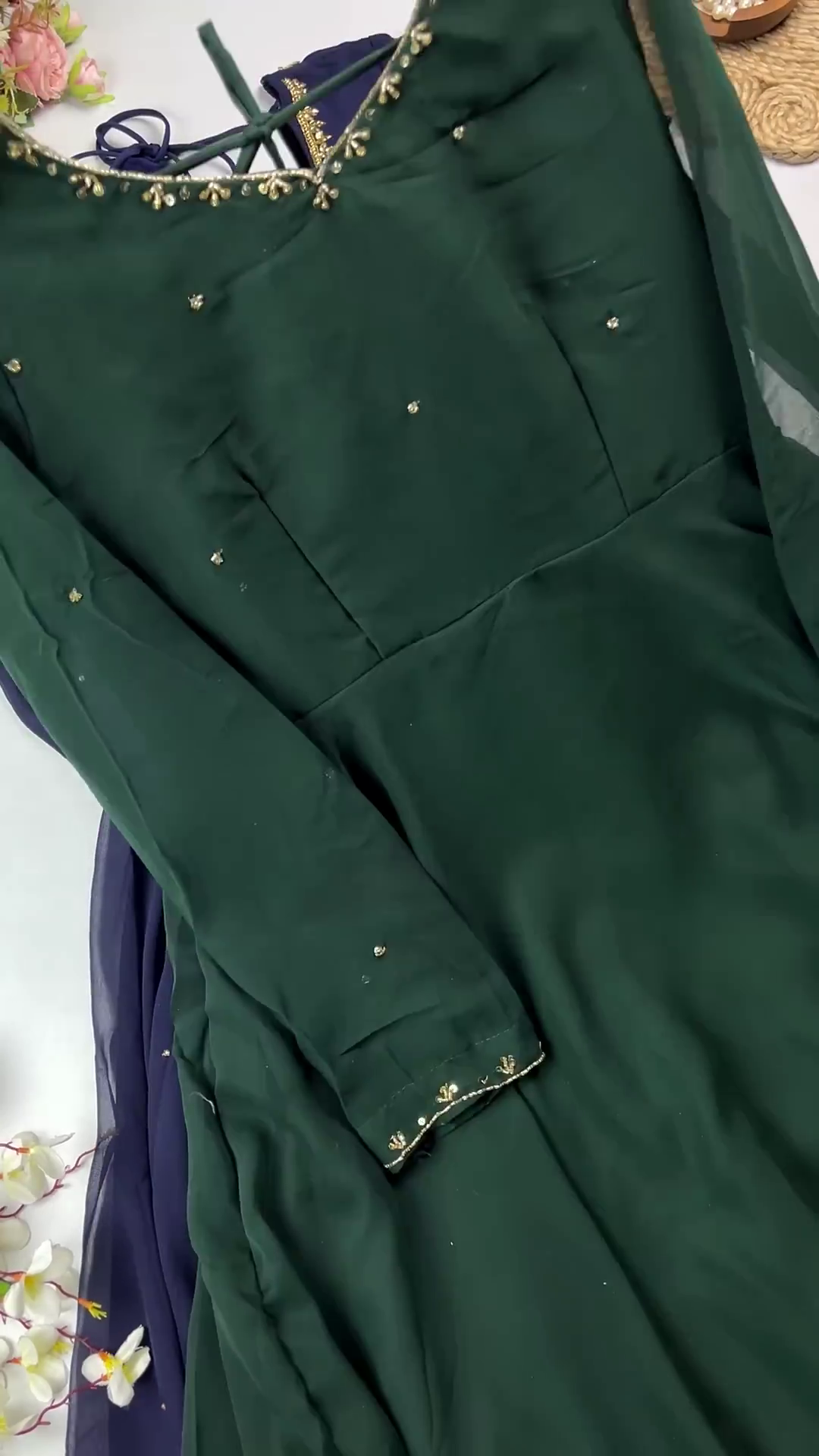 Feature Details Type Premium Designer Embroidered Anarkali Color Forest Green with Gold-Toned Accents Work Type Minimalist Zari Embroidery • Tiny Sequin/Bead Highlights Neckline Sophisticated Curved Neck with Zari Framing Sleeves Full-Length with Scalloped Embroidered Cuffs Back Style Adjustable Dori Tie-Ups for a Secure Fit Fabric High-Quality Georgette or Crepe-Finish Fabric