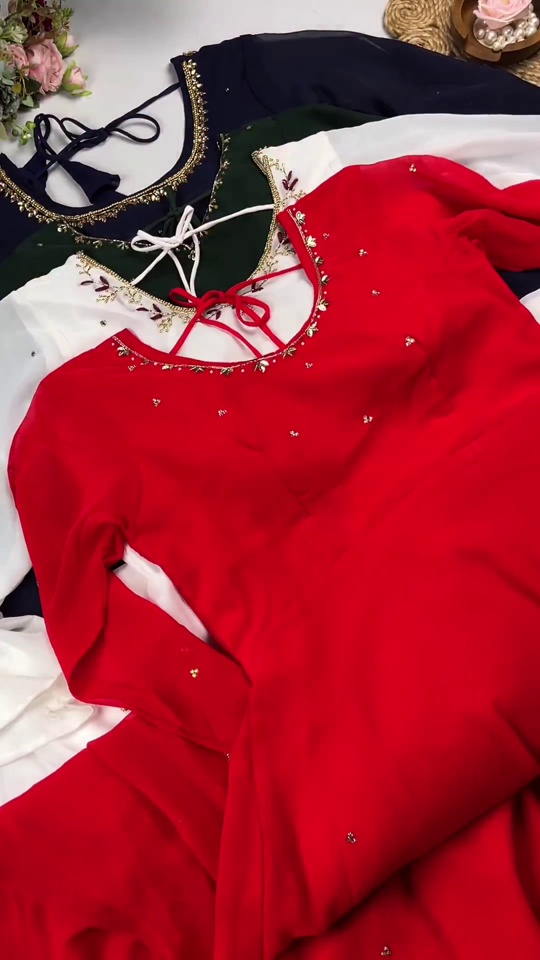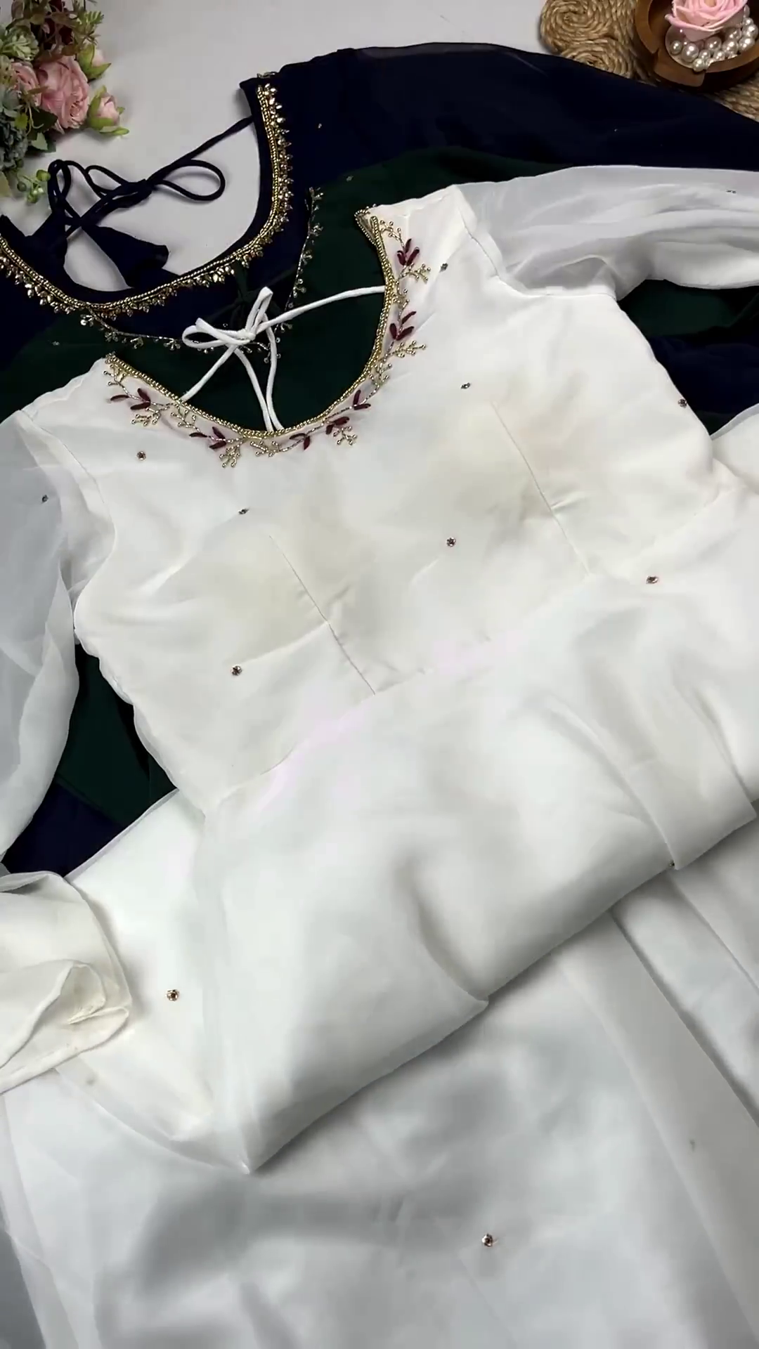 ✔️ Detailed Neckline: Close-up views highlight the precision-stitched golden threadwork along the neckline, as seen in the flat-lay.