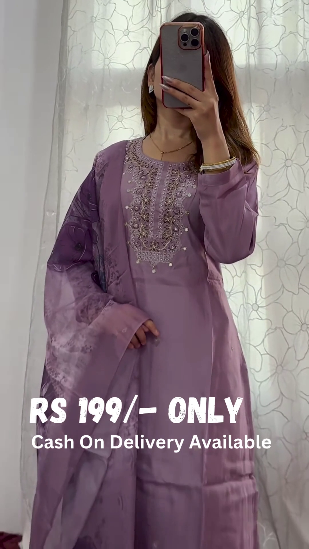 Design & Craftsmanship: This graceful lavender suit is adorned with delicate pearl and mirror embroidery on the neckline, adding an exquisite touch of sophistication. The straight-cut silhouette, paired with finely stitched details, creates an effortlessly chic appeal, making it perfect for both formal and festive occasions.
